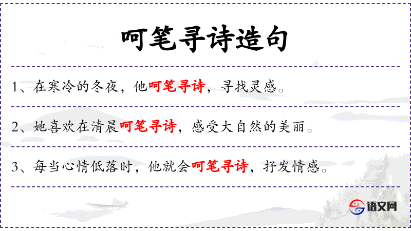 - 呵笔寻诗:指用笔写下诗句,寻找灵感。
