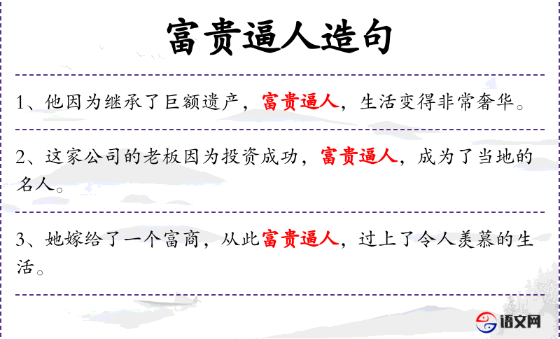 - 富贵逼人:形容财富和地位非常高,给人以压迫感。