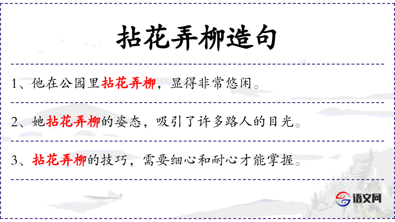 - 拈花弄柳:这个成语源自**古代,通常用来形容书法、绘画、雕刻等艺术或手工艺的高超技艺。