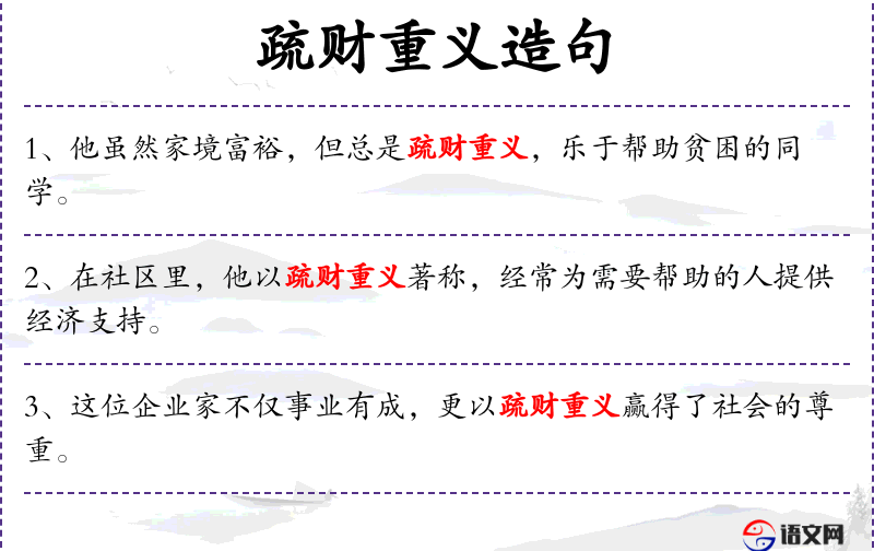 1. 【疏财重义】 - 疏财:以财物分人。讲义气,轻视钱财。多指出钱帮助遭难的人。