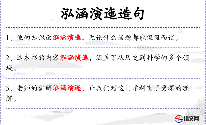泓:水深;涵:包含;演:长流;迤:延伸。比喻学问渊博精深。