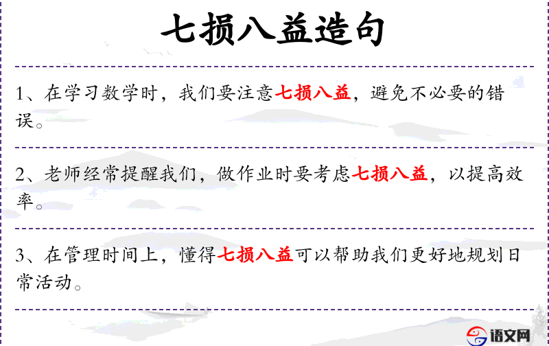 1. 【七损八益】 指女子月事宜以时下,男子精气宜于充盈。中医述人生长发育过程,女子以七为纪,男子以八为纪,故七指女,八指男。