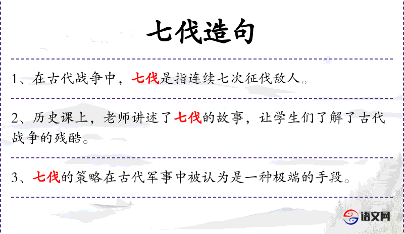 1. 【七伐】 语出《书.牧誓》"夫子勖哉,不愆于四伐五伐,六伐七伐,乃止齐焉。"孔传"伐谓击刺,少则四五,多则六七,以为例。"后以"七伐"指四处征伐。