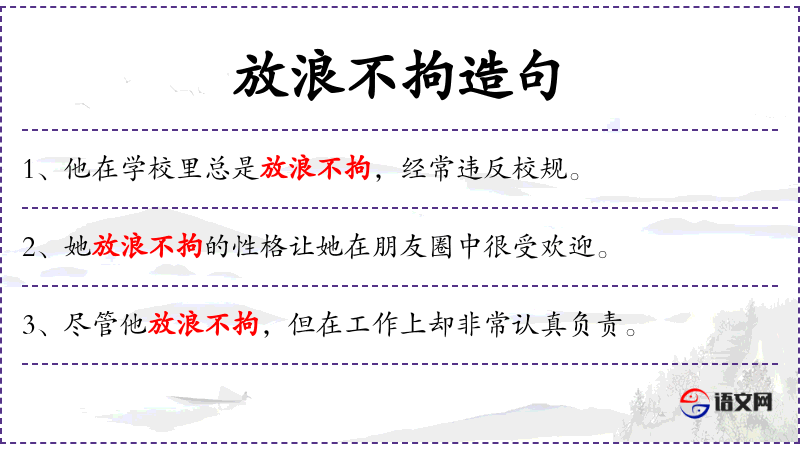 - 放浪不拘:形容词短语,意指行为不受约束,自由散漫。