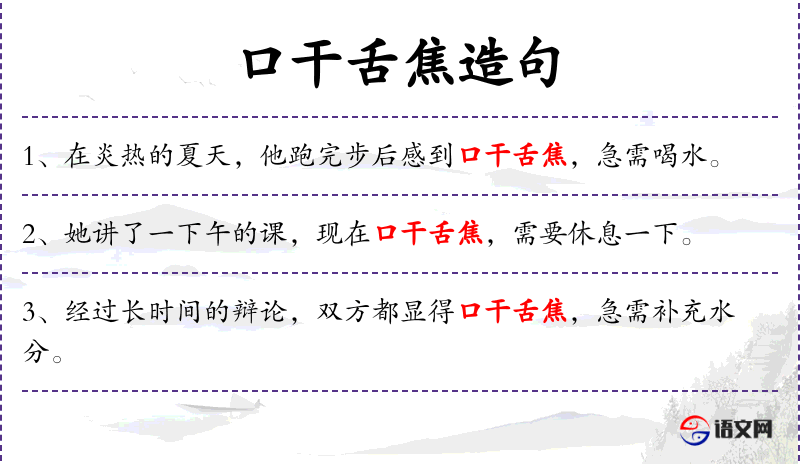 - 口干舌焦:形容口渴到极点,舌头干燥。