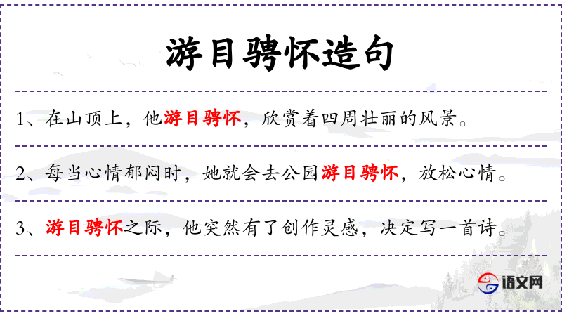 1. 【游目骋怀】 - 游目:远眺;骋怀:放开胸怀,往远处想。纵目四望,开阔心胸。