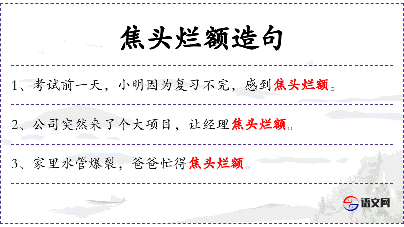 2. 【焦头烂额】 - 烧焦了头,灼伤了额。比喻非常狼狈窘迫。有时也形容忙得不知如何是好,带有夸张的意思。