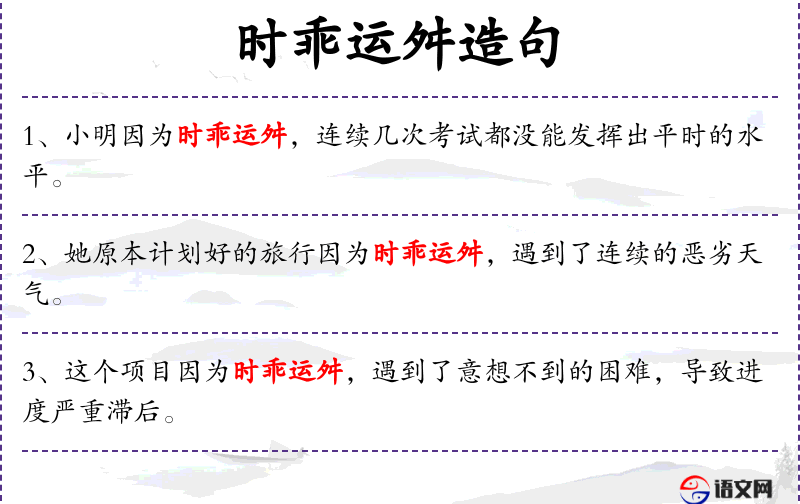 “时乖运舛”是一个中文成语,源自古代文学,用来形容时运不佳,遭遇不幸。这个成语的使用增加了句子的文化深度,反映了**人对命运和运气的看法。
