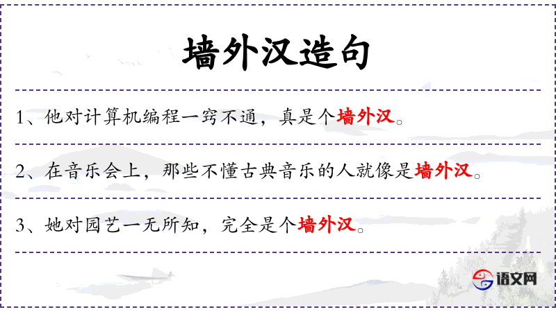 - 谓语:对园艺一无所知,完全是个墙外汉