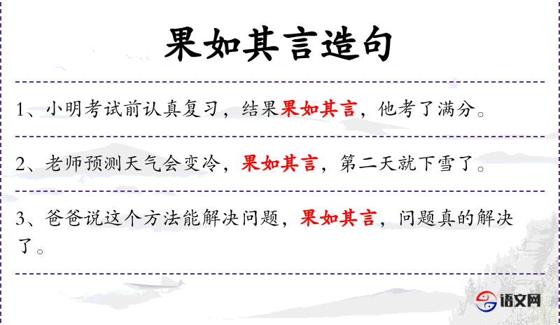 2. 【果如其言】 - 果然象他说的那样。指事情的变化和预想的一样。