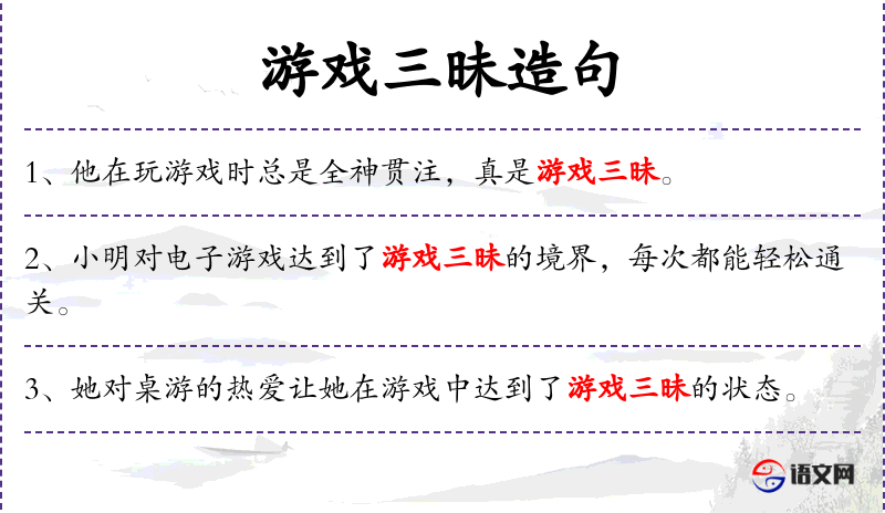 3. 【游戏三昧】 原为佛家语,意思是排除杂念,使心神平静。也比喻事物的精义、决窍。后指用游戏的态度对待一切。