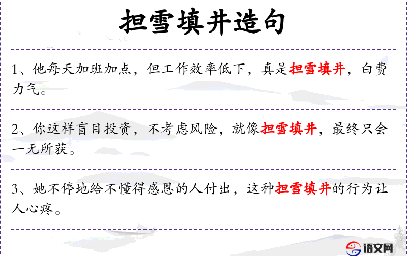 - 担雪填井:成语,比喻做无用功或白费力气。