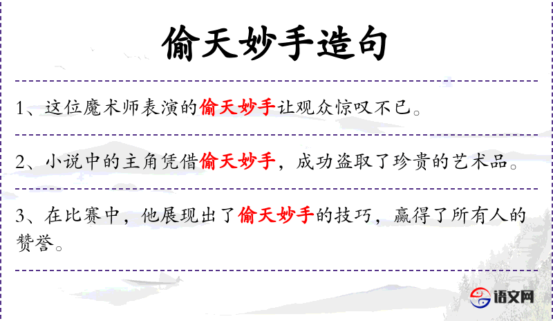 - 偷天妙手:形容技艺非常高超,常用于比喻。
