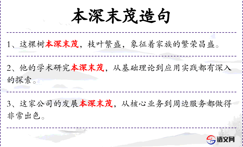 2. 【本深末茂】 - 本:树根;末:树梢。根深而枝叶茂盛。比喻事物根底深厚而富于生机,蓬勃茁壮。