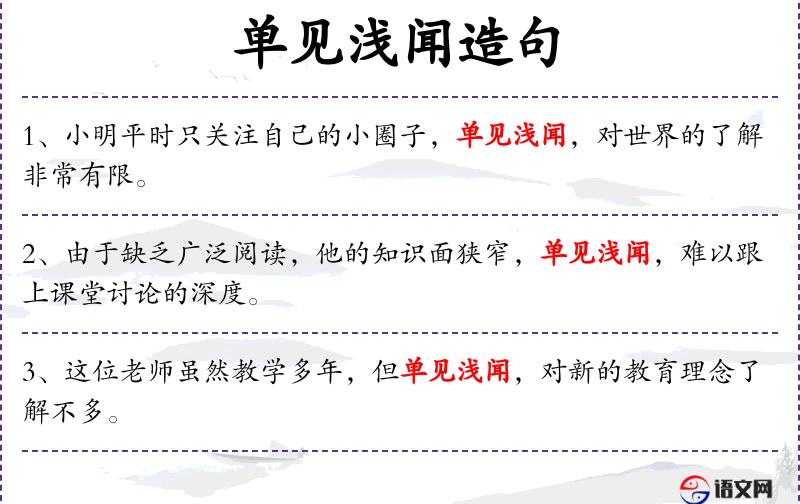 - 单见浅闻:limited knowledge and shallow experiences, 見識が狭く浅い, begrenztem Wissen und oberflächlichen Erfahrungen