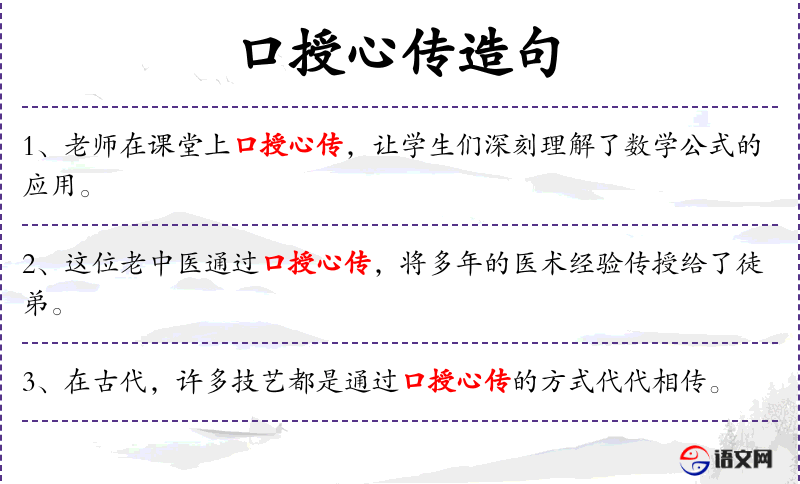 - 口授心传:指通过口头传授和内心领悟的方式。