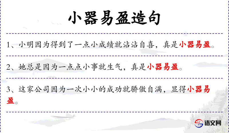 - 小器易盈:成语,比喻气量小,容易满足或生气。