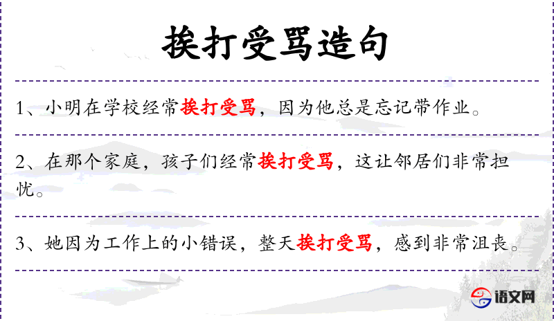 - 宾语:无明确宾语,但“挨打受骂”可以视为宾语成分