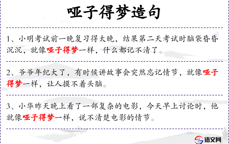“哑子得梦”是一个比喻,源自*文化,用来形容说话不清晰或含糊。这个比喻反映了语言学中的常见问题,并可能在鼓励学*者时使用。