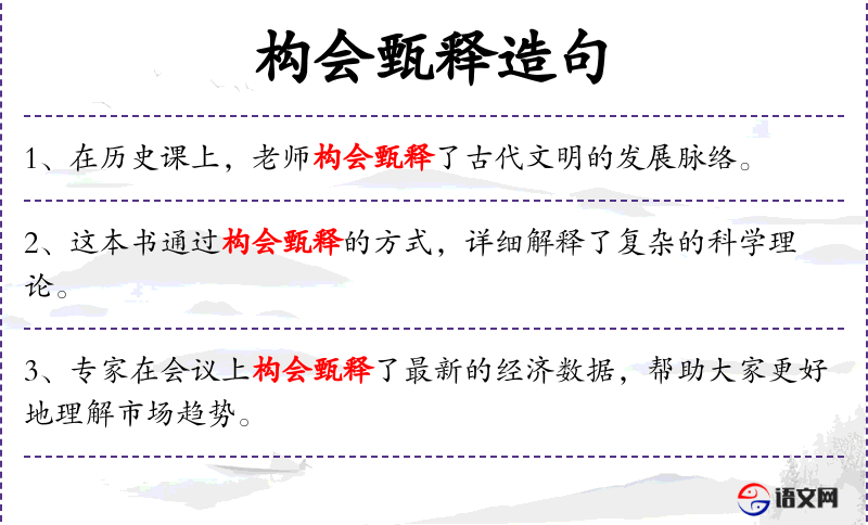 3. 【构会甄释】 构:组成;会:聚合;甄:审查鉴定;释:解释。将众说汇集到一起进行比较考核,择善而从。指妥善地进行解说。