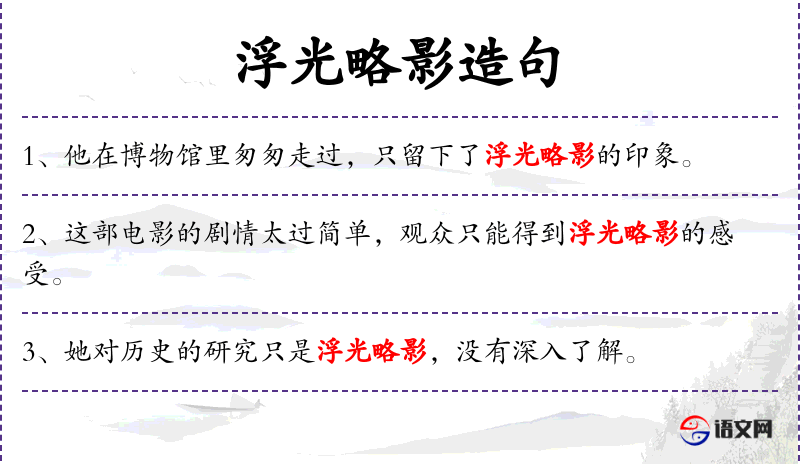 3. 【浮光略影】 比喻观察不细致,学习不深入,印象不深刻。同“浮光掠影”。