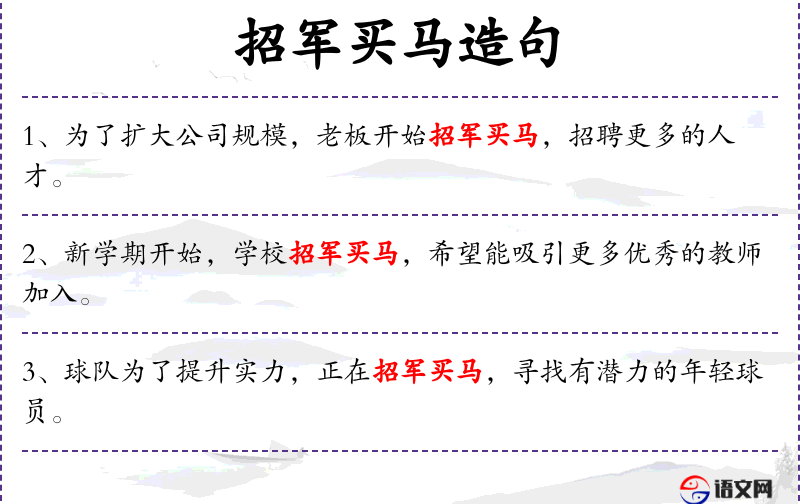 - 招军买马:这个成语源自古代军事用语,现在用来比喻招揽人才。