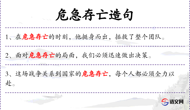 3. 【危急存亡】 危急:危险而紧急。指关系到生存灭亡的紧急关头。