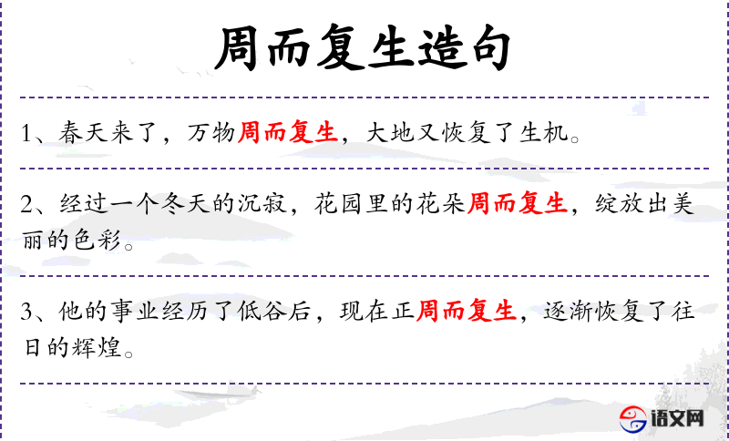 1. 【周而复生】 周:环绕一周;复:又。转了一圈又一圈,不断循环