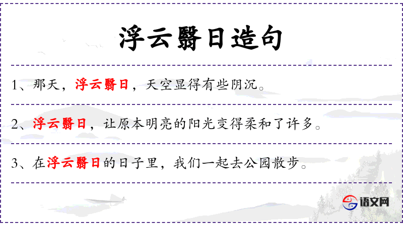 1. 【浮云翳日】 - 浮云:漂浮在空中的云;翳:遮蔽。浮云遮住太阳。比喻奸佞之徒蒙蔽君主的光明,但时间不会太长。