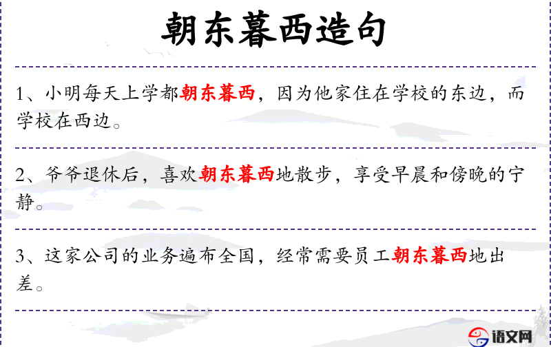4. 【朝东暮西】 朝:早晨。早晨在东,晚上在西。指行踪不定。比喻变来变去,不专一。
