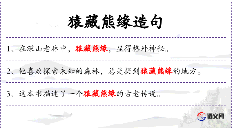2. 【猿藏熊缘】 - 猿藏:猿藏身之处;熊缘:熊不舍离开的地方。指猿和熊的巢穴。