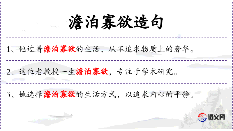 3. 【澹泊寡欲】 - 澹泊:恬淡;寡:少;欲:欲望。形容心情恬淡,不图名利。