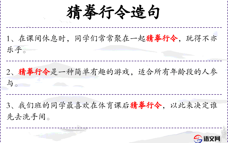 4. 【猜拳行令】 划拳行酒令。形容宴饮欢畅。猜拳:饮酒时两人同时伸出手指并说一数,如数与两人伸出手指的总数相符为胜,输者罚酒。