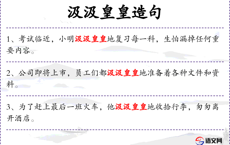 2. 【汲汲皇皇】 - 汲汲:急切的样子;皇皇:惶恐不安的样子。心情急切,举止匆忙。