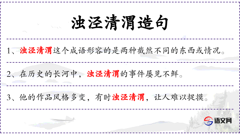 4. 【浊泾清渭】 渭水清,泾水浊。比喻界限分明。