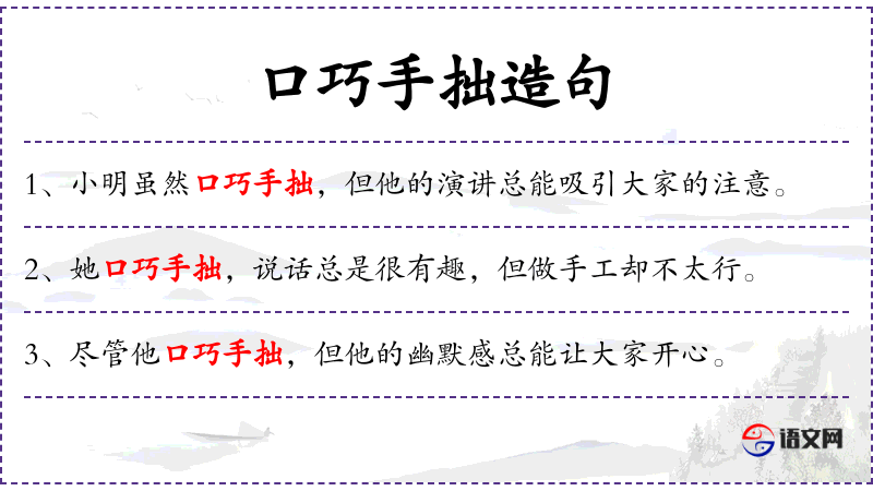 - 口巧手拙:形容人说话巧妙,但动手能力差。
