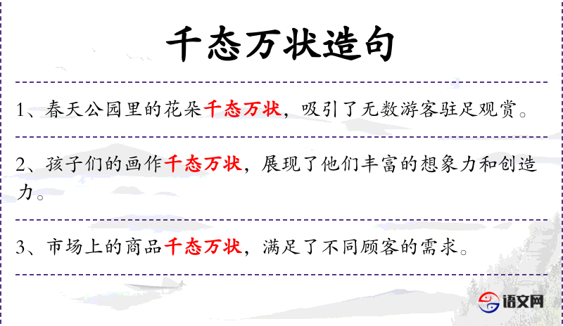 - 千态万状:形容多种多样的形态和状态。