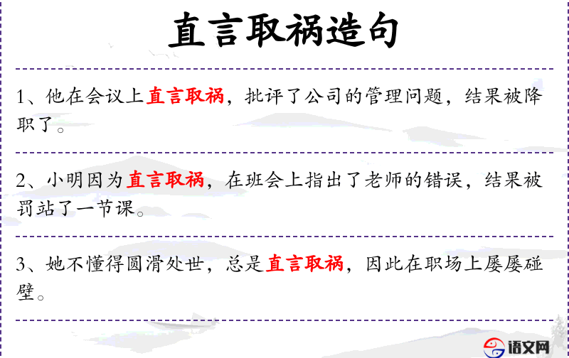 1. 【直言取祸】 《左传·成公十五年》:“子好直言,必及于难。”