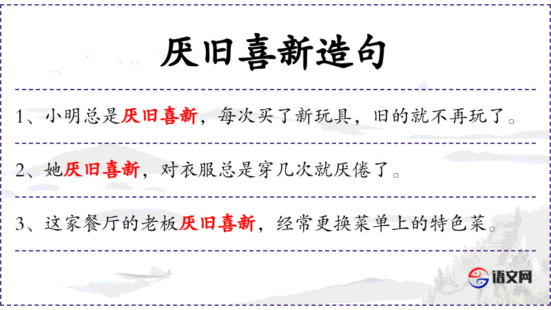 - 厌旧喜新:成语,表示不喜欢旧的,喜欢新的。