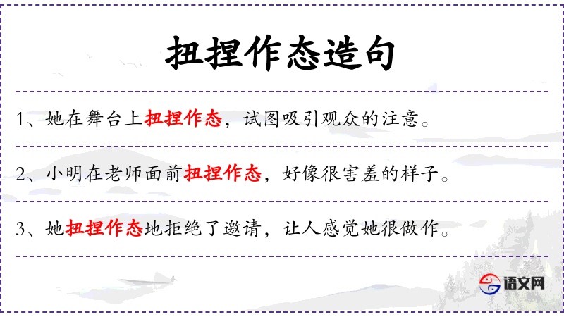 - 在不同的语言中,表达“扭捏作态”的方式可能有所不同,但核心意义是相似的,即通过不自然的动作来吸引注意。