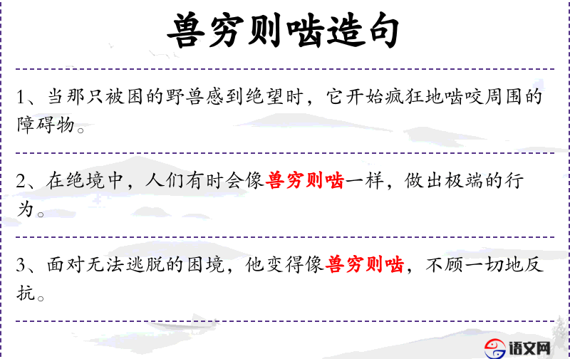 成语“兽穷则啮”:这个成语源自**古代,形容动物在被逼到绝境时会采取极端的自卫行为。在现代汉语中,这个成语常用来比喻人在绝境时的极端反应。