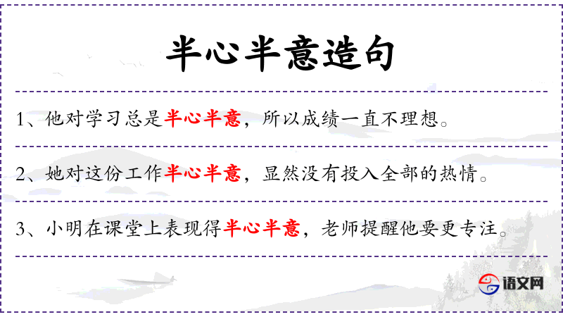 - 成语典故:“半心半意”和“差强人意”都是常用的成语,体现了汉语中丰富的表达方式。