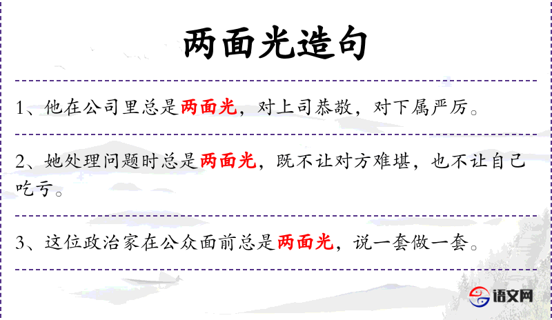 句子中的“两面光”是一个比喻,反映了**人对于人际关系中一致性和诚信的重视。在商业文化中,公平和一致的客户服务被视为重要的职业道德。