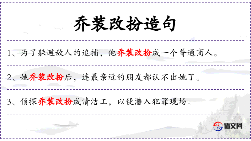 - 乔装改扮:指改变外貌或身份以隐藏真实身份。