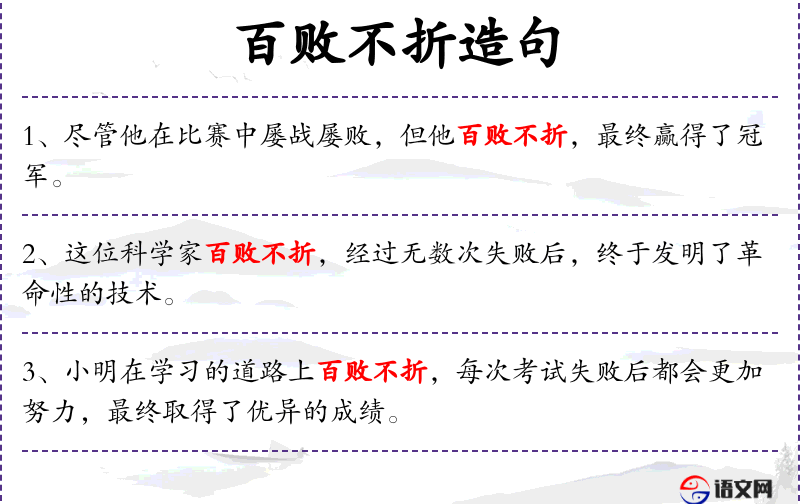 9. 【百败不折】 折:屈服。即使失败100次也绝不屈服。形容意志坚强。