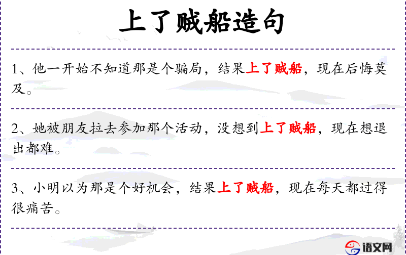 1. 【上了贼船】 - 比喻已入歧途,难以抽身。