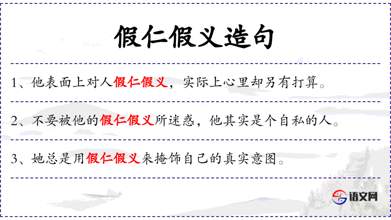 - 宾语:假仁假义、别人的信任