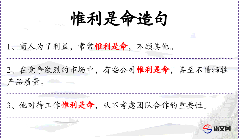 - 惟利是命:这个词组意味着他只关心利益,把利益看作是生命一样重要。