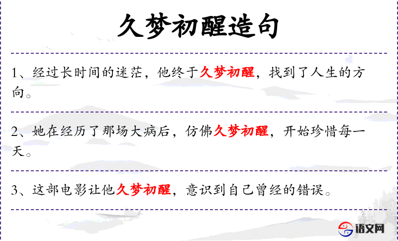 - 成语:久梦初醒,源自**传统文化,比喻长期迷茫后突然明白。