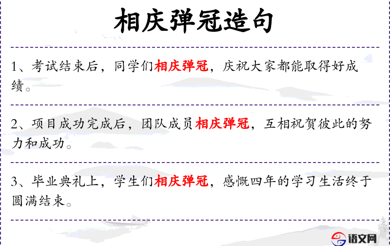 4. 【相庆弹冠】 - 弹冠:掸去帽子上的灰尘,准备做官。指官场中一人当了官或升了官,同伙就互相庆贺将有官可做。